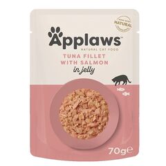 APPLAWS Cat filet z tuńczyka z łososiem w galaretce dla kota 16 x 70g Mokra karma dla kota z filetem z tuńczyka i łososiem w galaretce to połączenie, które zapewnia zarówno doskonały smak, jak i wartości odżywcze. Zawiera wysokiej jakości białko pochodzące z tuńczyka i łososia, które wspiera...
